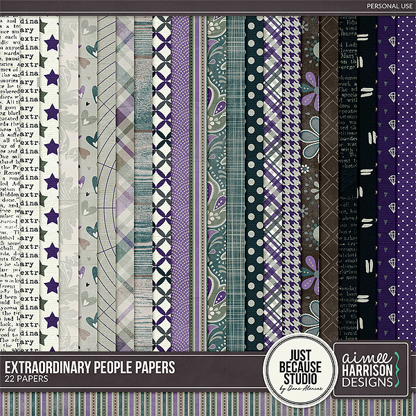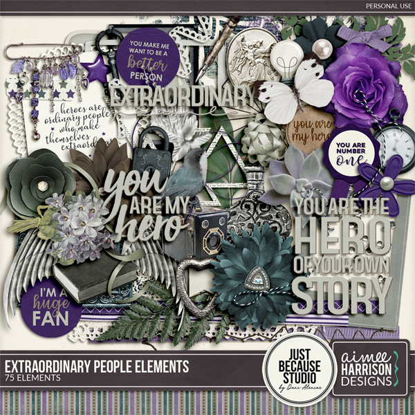Heroes are ordinary people who make themselves extraordinary and inspire us to be extraordinary, too. The Extraordinary People digital kit by JB Studio and Aimee Harrison Designs was created to celebrate the heroes in our lives, those who inspire us to be better and give our best to our loved ones. They might be a grandparent, a parent, a sibling, a teacher, a friend, or a famous person who inspire us with their extraordinary acts. The kit mixes traditional style with realistic elements and is packed with 20 patterned papers, 10 solid papers, 1 set of alphas, and 75 elements like wordarts, flowers, buttons, ribbons, a card, metal embellishments, a bird, a vintage camera, stars, wings, and more. You can also find 6 coordinating packs: artsy papers, flowers, wordarts & wordbits, graffiti, messy edges, and titles.